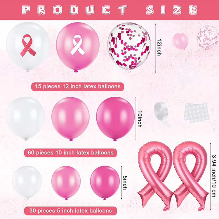 5 шт. 12-дюймовых белых шаров с узором из розовой ленты, 5 шт. 12-дюймовых розовых шаров с узором из белой ленты, 5 шт. 12-дюймовых блестящих шаров с раком молочной железы, 60 шт. 10-дюймовых латексных шаров белого, розового, светло-розового цвета, 30 шт. кусочки 5-дюймовых латексных шаров белого, светло-розового, розового цвета, цепочка из воздушных шаров длиной 5 метров с двойными отверстиями, 40 круглых наклеек с точками склеивания в 2 листах и 2 фольгированных шара в форме розовых лент.
