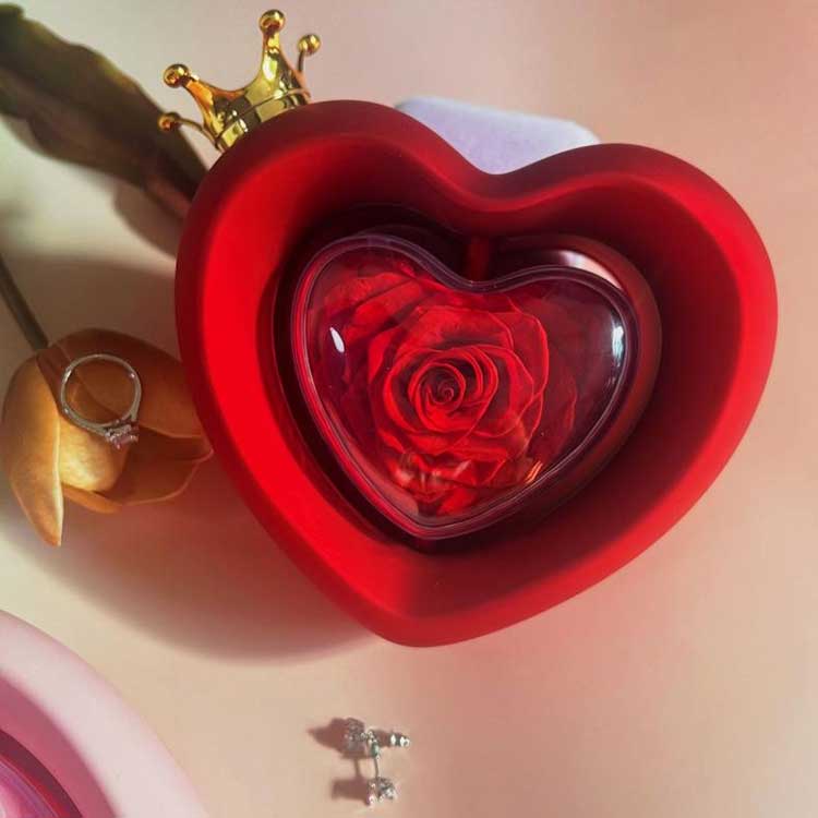 В шкатулке для драгоценностей «Роза в форме сердца» используются стабилизированные цветы класса А, цвет и текстура которых неотличимы от свежих цветов.
