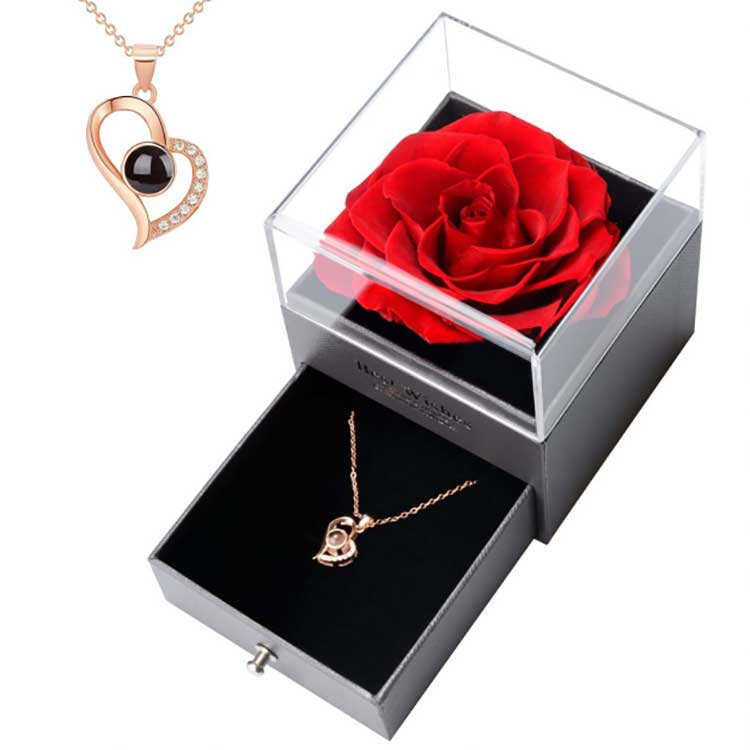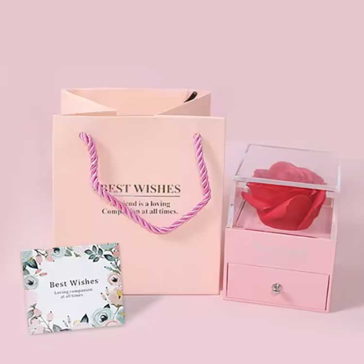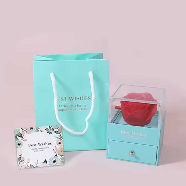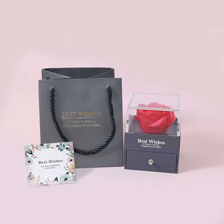 Ювелирные изделия в подарочной коробке «Бессмертный цветок» также являются нашим эксклюзивным дизайном. Для этого украшения мы разработали три основных цвета: золото, серебро и розовое золото. Он изготовлен с использованием высокоточной гальванической технологии, гарантирующей, что он не выцветет и не заржавеет даже после длительного ношения. Бриллианты в украшениях изготовлены из циркония марки 5А и тщательно закреплены дизайнером с 20-летним опытом.