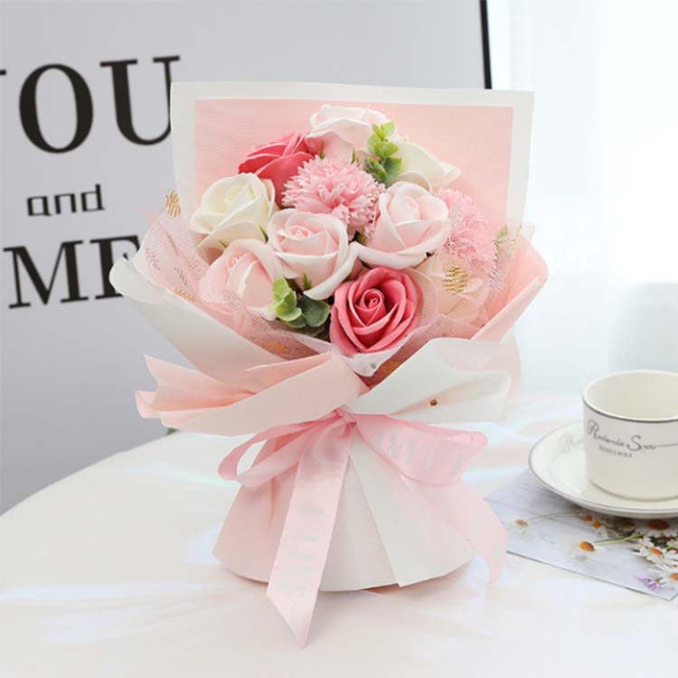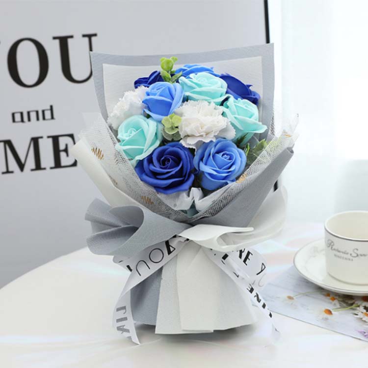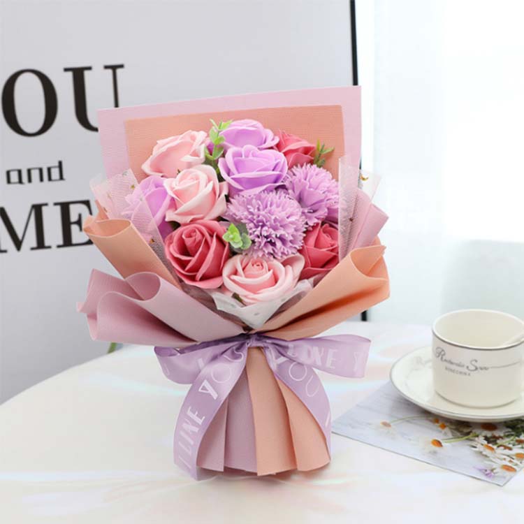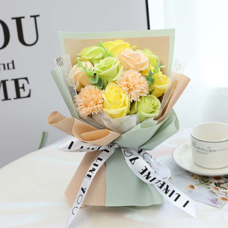Мыльный букет состоит из 11 ярких цветов и украшен лентой. Подходящие случаи включают в себя: исповедь, благодарность.е, вручение подарков, сезонные праздники, деловое общение, награждение и поминки, корпоративные льготы и т. д.
